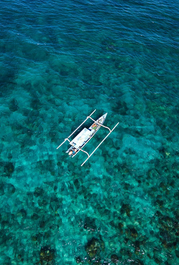 Aerial photo of a boat at Candi Dasa, Bali.