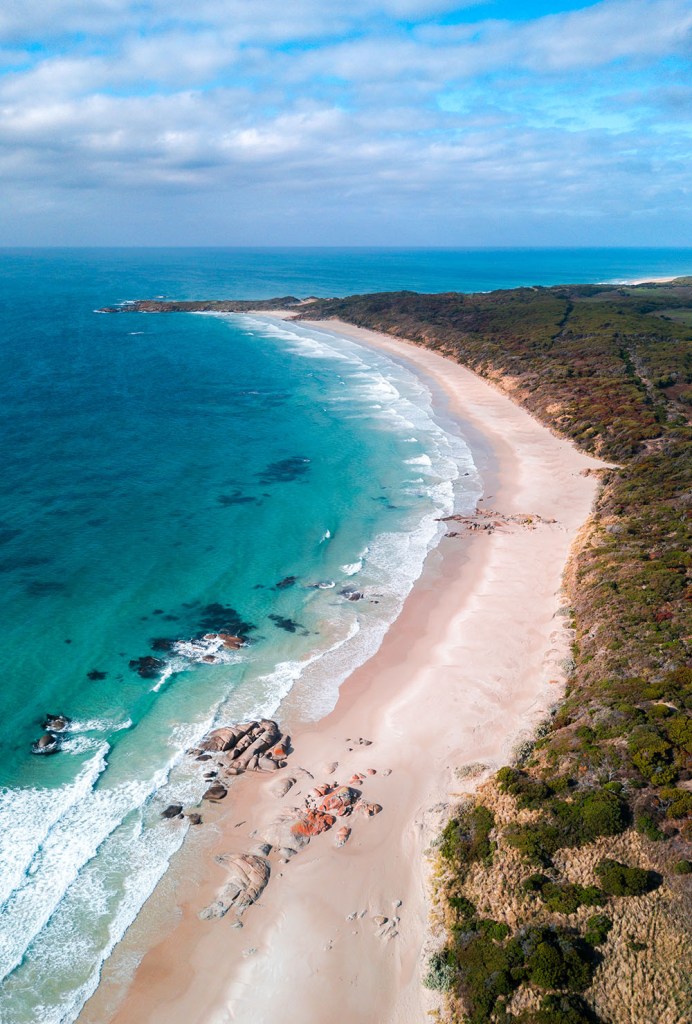 An aerial photograph of Disappointment Bay in Tasmania, Australia, on a sunny afternoon.