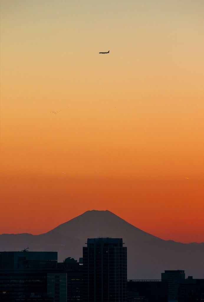 A plane flies high over Tokyo with Mt. Fuji looming in the background at sunset.
