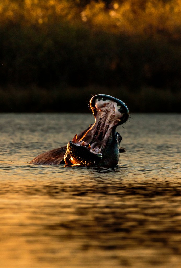 A hippo yawns, bearing its large teeth in the Okavango Delta, Botswana.
