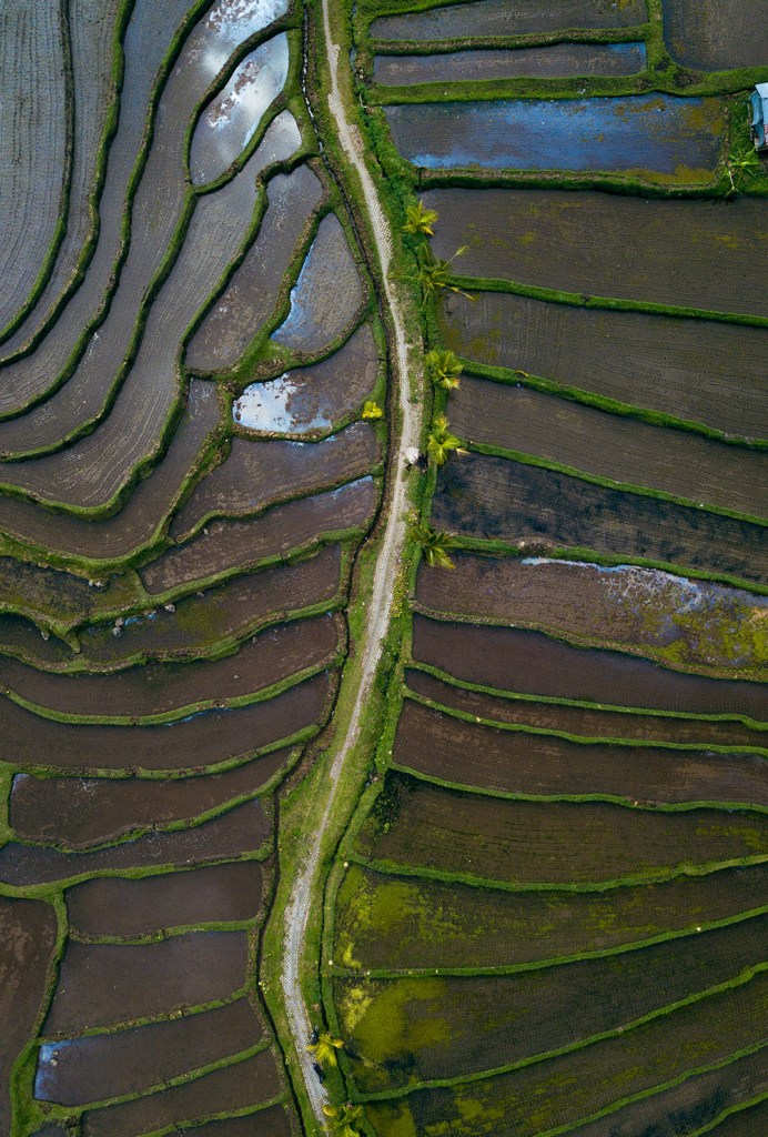 Top-down aerial photograph of Jatiluweh Rice Terraces, located in Bali.