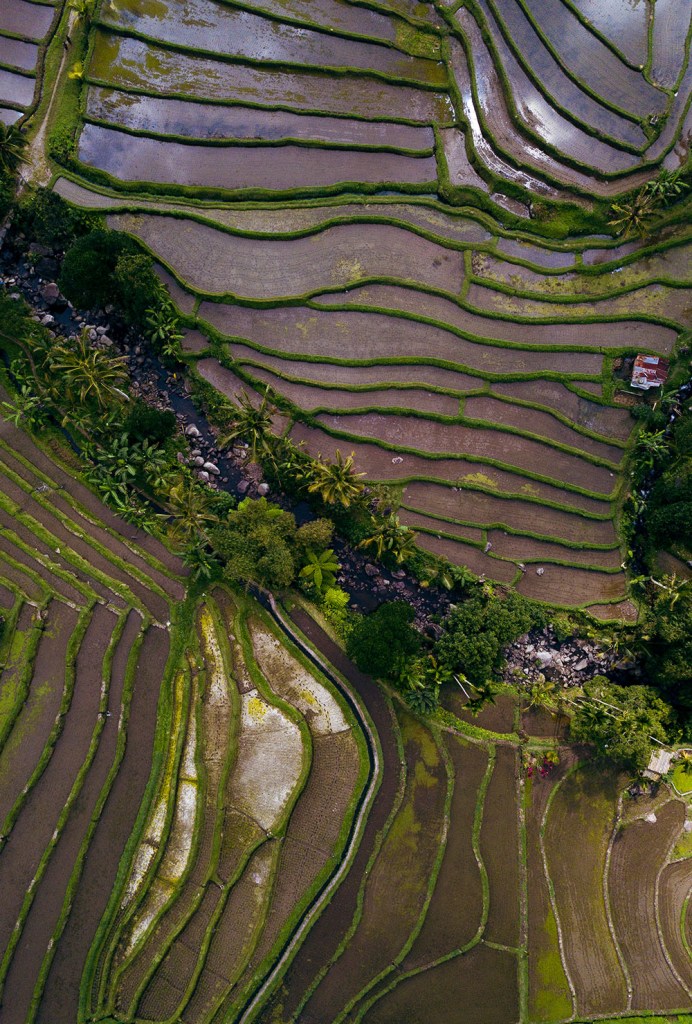 Top-down aerial photograph of Jatiluweh Rice Terraces, located in Bali.