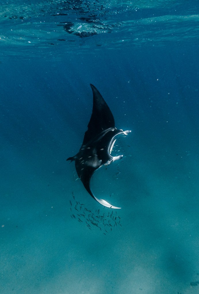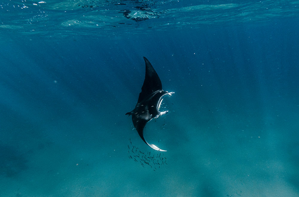 A Manta Ray swims gracefully through the water near Coral Bay, Western Australia.