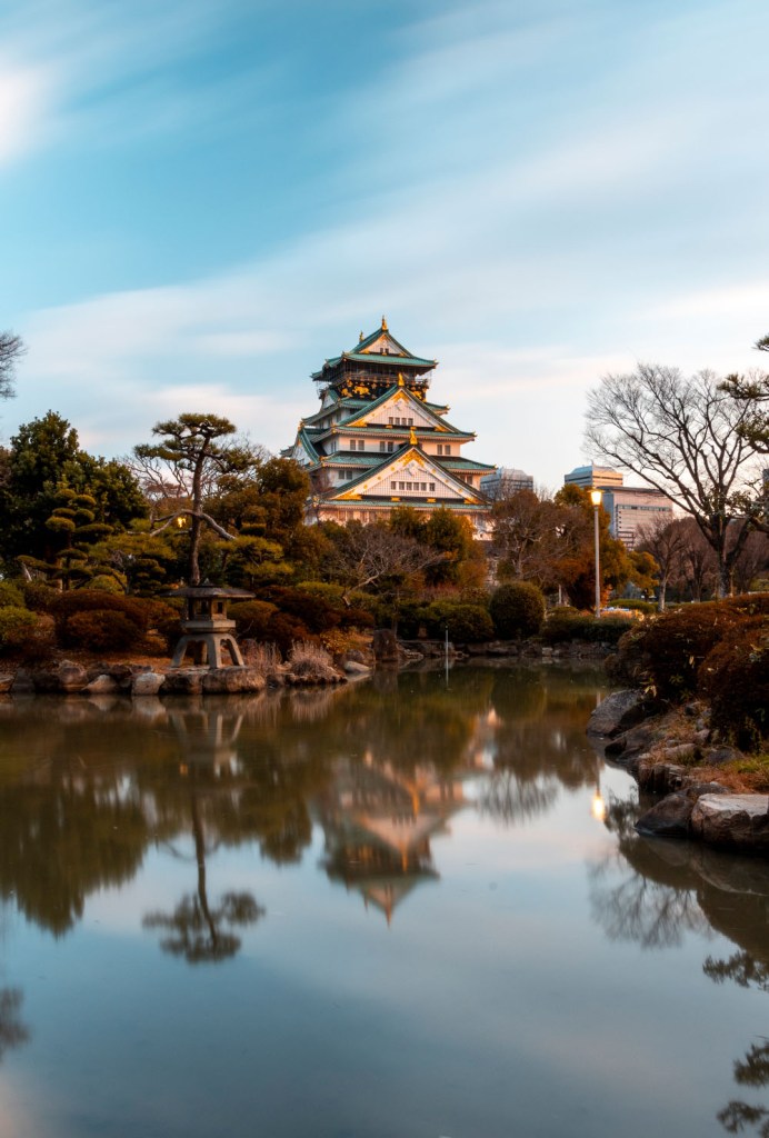 Sunrise photograph of Osaka Castle from the Japanese Garden.