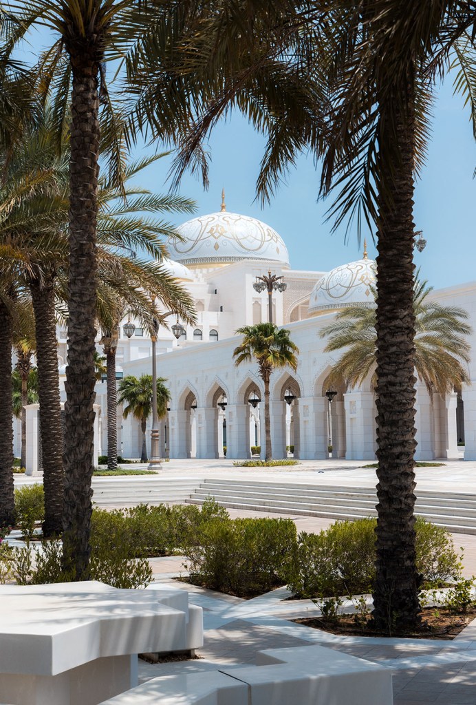 Photograph of Qasr Al Watan surrounded by Palm Trees.