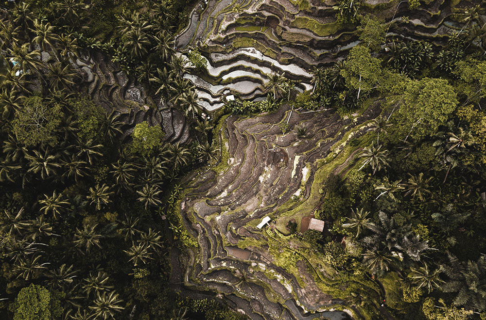 Aerial shot of the Tegelalang Rice Terraces in Ubud, Bali.