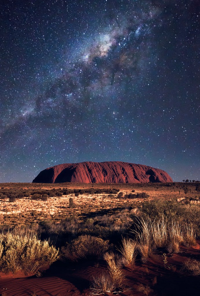 Uluru at sunset with the Milky Way looming above in the Northern Territory.