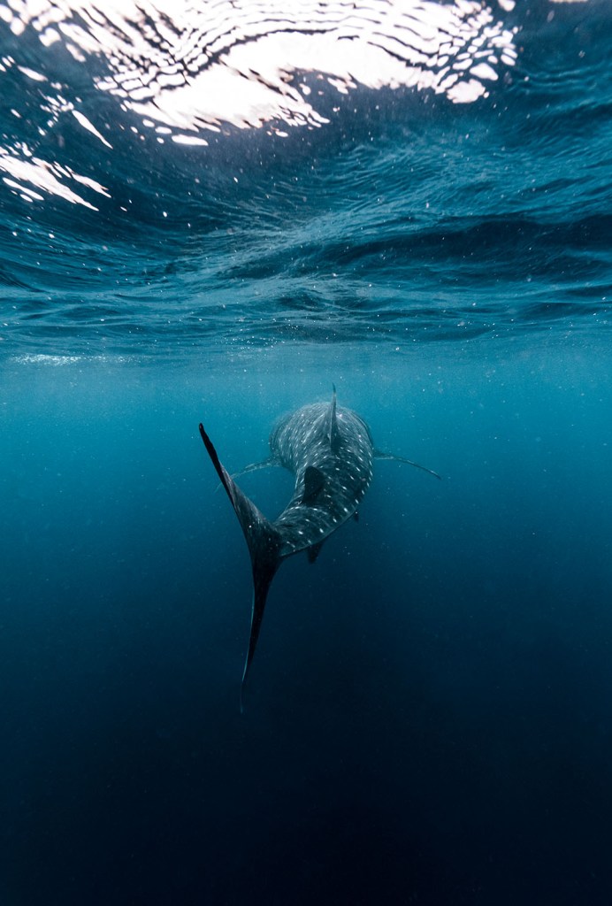 A lone whale shark swims above deep water off the coast of Exmouth, Western Australia.